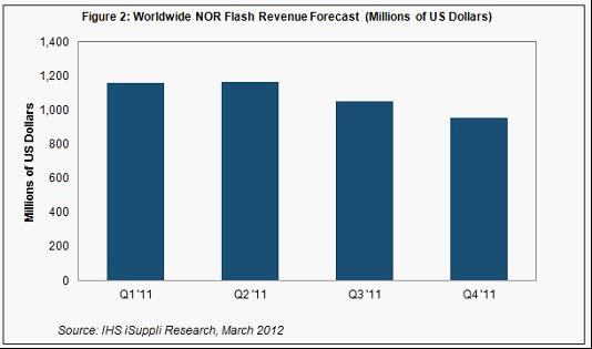 據(jù)IHS iSuppli公司的移動(dòng)市場存儲(chǔ)報(bào)告,由于經(jīng)濟(jì)形勢(shì)糟糕和泰國洪災(zāi)導(dǎo)致PC出貨量下降,2011年第四季度NOR閃存營業(yè)收入環(huán)比下降9%。
