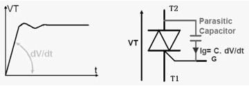 電壓上升率的抵制:dv/dt指的是在關(guān)斷狀態(tài)下電壓的上升斜率,這是防止誤觸發(fā)的一個(gè)關(guān)鍵參數(shù)。此值超限將可能導(dǎo)致可控硅出現(xiàn)誤導(dǎo)通的現(xiàn)象。由于可控硅的制造工藝決定了A2與G之間會(huì)存在寄生電容,如圖2所示。我們知道dv/dt的變化在電容的兩端會(huì)出現(xiàn)等效電流,這個(gè)電流就會(huì)成為Ig,也就是出現(xiàn)了觸發(fā)電流,導(dǎo)致誤觸發(fā)。