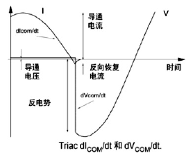 切換電壓上升率dVCOM/dt。驅(qū)動(dòng)高電抗性的負(fù)載時(shí),負(fù)載電壓和電流的波形間通常發(fā)生實(shí)質(zhì)性的相位移動(dòng)。當(dāng)負(fù)載電流過零時(shí)雙向可控硅發(fā)生切換,由于相位差電壓并不為零。這時(shí)雙向可控硅須立即阻斷該電壓。產(chǎn)生的切換電壓上升率(dVCOM/dt)若超過允許值,會(huì)迫使雙向可控硅回復(fù)導(dǎo)通狀態(tài),因?yàn)檩d流子沒有充分的時(shí)間自結(jié)上撤出,如圖3所示。[page]