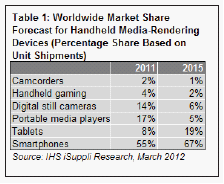 確實,基于核心用途,手持設備能夠向消費者提供優(yōu)異的內容質量。即使如此,相機和游戲機等專用平臺的市場也在不斷萎縮,因為消費者現在渴望全能型產品,寧愿擁有這類多用設備,而不是擁有多個主要專注于一種內容呈現形式的設備。IHS公司認為,智能手機和平板電腦顯然屬于全能型的靈活設備,所以其受歡迎程度和銷量不斷上升。