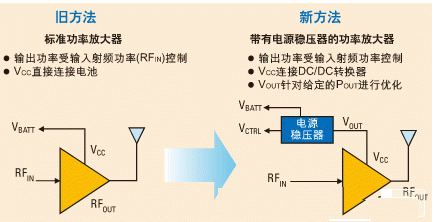 使用DC-DC轉(zhuǎn)換器(功率放大器電源穩(wěn)壓器)的主要目的是減少分母中的Pdc因子。當(dāng)功率放大器與電池直接相連時,Pdc=Vbatt*Ibatt,而當(dāng)它使用功率放大器電源穩(wěn)壓器供電時,Pdc=V o*I o。現(xiàn)在我們能夠看出,為了增加PAE,V o和Io 必須低于Vbatt和Ibatt。這可以通過降低發(fā)射的射頻功率電平,降低功率放大器電源穩(wěn)壓器的輸出電壓來實現(xiàn)。這樣也降低了Io (功率放大器的吸收電流),并且由于DC-DC轉(zhuǎn)換器的高效性,電池的輸出電流也會降低?! ?br />