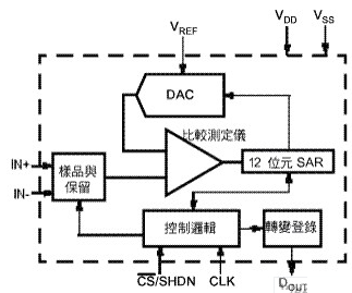 在本方塊圖中,取樣/保持、比較器、大部份的數(shù)字模擬轉(zhuǎn)換器及12位SAR都是模擬;其余電路部份是數(shù)字。結(jié)果,本轉(zhuǎn)換器內(nèi)之模擬電路耗用大部份的電源與電流,除數(shù)字模擬轉(zhuǎn)換器與接口中發(fā)生的小量切換電流外,數(shù)字電路的消耗電流極少?! ?br />