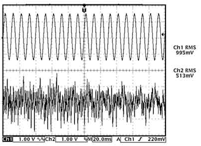 常見的音源,包含樂音和語音,其RMS值往往比峰值輸出功率低得多。通常情況下,語音的峰值與RMS功率之比(即波峰因數(shù))為12dB,而樂音的波峰因數(shù)為 18~20dB。圖1為時域內(nèi)音頻信號和正弦波的波形圖,給出了采用示波器測量兩者RMS值的結(jié)果。雖然音頻信號峰值略高于正弦波,但其RMS值大概只有正弦波的一半。同樣,音頻信號可能存在突變,但正如測量結(jié)果所示,其平均值仍遠低于正弦波。雖然音頻信號可能具有與正弦波相近的峰值,但D類放大器表現(xiàn)出來的熱效應卻大大低于正弦波。因此,測量系統(tǒng)的熱性能時,最好使用實際音頻信號而非正弦波作為信號源。如果只能使用正弦波,則所得到的熱性能要比實際系統(tǒng)差。