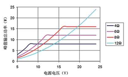 D 類放大器MOSFET輸出級的導通電阻會影響它的效率和峰值電流能力。降低負載的峰值電流可減少MOSFET的I2R損耗,進而提高效率。要降低峰值電流,應在保證輸出功率, D類放大器的電壓擺幅以及電源電壓的限制的條件下,選擇最大阻抗的揚聲器,如圖4所示。本例中,假設(shè)D類放大器的輸出電流為2A,電源電壓范圍為 5~24V。電源電壓大于等于8V時,4Ω的負載電流將達到2A,相應的最大連續(xù)輸出功率為8W。如果8W的輸出功率能滿足要求,則可以考慮使用一個 12Ω揚聲器和15V供電電壓,此時的峰值電流限制在1.25A,對應的最大連續(xù)輸出功率為9.4W。此外,12Ω負載的工作效率要比4Ω負載的高出 10%~15%。實際效率的提高根據(jù)不同D類放大器而異。雖然大多數(shù)揚聲器的阻抗都采用4Ω或8Ω,但也可采用其他阻抗的揚聲器實現(xiàn)更高效的散熱。