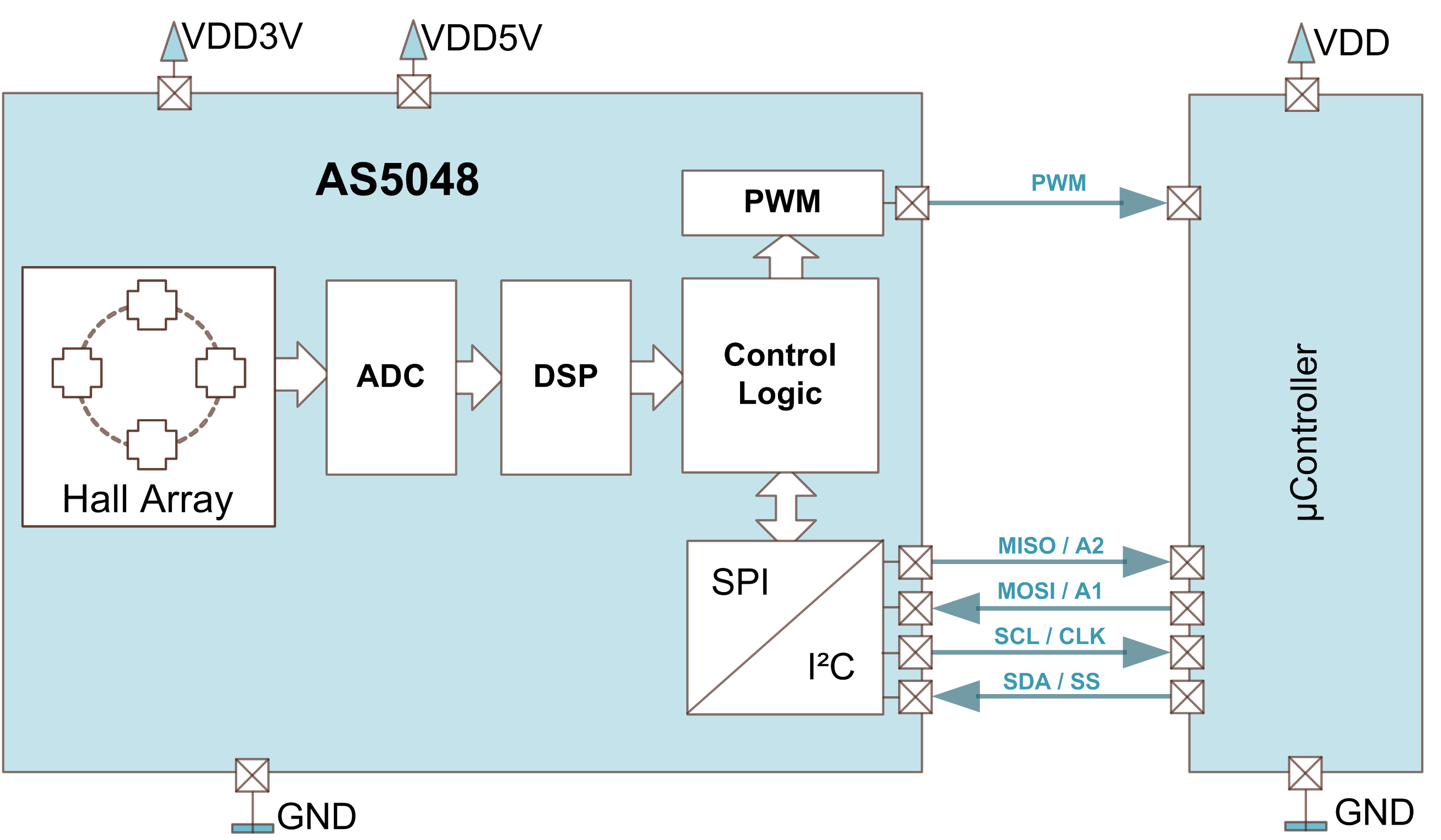 與奧地利微電子現(xiàn)有的磁性編碼器一樣,由于采用了獨特的集成霍爾傳感器和信號處理電路,這款器件能有效地排除離散磁場的干擾。這使得AS5048非常適合應用在電力和磁性噪聲較大的工業(yè)和醫(yī)療環(huán)境中。