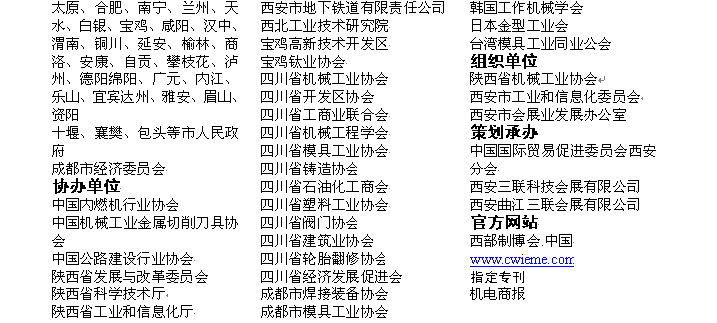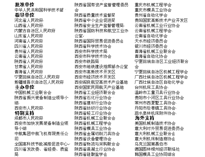 ●巡回推介會:組委會安排專人前往包括省內(nèi)的寶雞、漢中、咸陽、延安、榆林、安康、渭南、銅川、商洛及鄰近省份山西、河南、湖北、甘肅、青海、寧夏、內(nèi)蒙、新彊等省的重點(diǎn)城市及重慶、貴州、云南、廣西、廣東、上海、北京以及浙江、山東、江蘇等省區(qū)重點(diǎn)裝備制造工業(yè)城市巡回推介宣傳本屆博覽會。