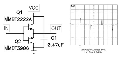 如圖2 hfe曲線所示,通常廠商都不會為這些低電流器件提供高于0.5A的電流。但是,該電路可提供大大高于0.5A的電流驅動,如圖1中的波形所示。就該波形而言,緩沖器由一個50Ω源驅動,負載為一個與1Ω電阻串聯(lián)的0.01 uF電容。該線跡顯示了1Ω電阻兩端的電壓,因此每段接線柱上的電流為2A.該數(shù)字還顯示MMBT2222A可以提供大約3A的電流,MMBT3906吸收2A的電流。