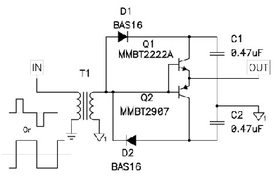 圖1中的示意圖顯示了一個NPN/PNP發(fā)射跟隨器對,其可用于緩沖控制IC的輸出。這可能會增加控制器的驅動能力并將驅動損耗轉移至外部組件。許多人都認為該特殊電路無法提供足夠的驅動電流。