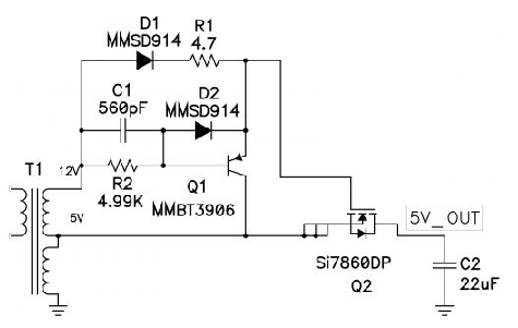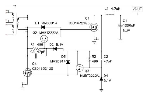 圖 4 顯示的是用于控制同步反向拓撲中 Q2 傳導的分立器件。該電路可以讓您控制開啟柵極電流并保護整流器柵極免受高反向電壓的損壞。該電路可以用變壓器輸出端的負電壓進行驅動。12V 輸入與 5V 輸出相比負電壓值很大,從而引起 Q1 傳導并短路電源 FET Q2 上的柵-源電壓,迅速將其關閉。由于基極電流流經 R2,因此在加速電容 C1 上就有了一個負電壓。在此期間,一次側 FET 將會發(fā)生傳導并在變壓器磁化電感中存儲能量。一次側 FET 關閉時,變壓器輸出電壓在正電壓范圍擺動。Q2 柵-源通過 D1 和 R1 被迅速前向偏置。C1 放電時,D2 對 Q1 基極-發(fā)射極連接進行保護。在一次側 FET 再次開啟之前,該電路會一直保持這種狀態(tài)。正如同步降壓轉換器那樣,輸出電流會真正地對輸出電容進行放電。開啟一次側 FET 會衰減變壓器二次側上的電壓并去除 Q2 的正驅動。這種轉換會導致明顯的貫通疊加一次側 FET 和 Q2 傳導次數(shù)。為了最小化該次數(shù),當一次側和二次側 FET 均開啟時,Q1 將會盡快地短路同步整流器上的柵-源。