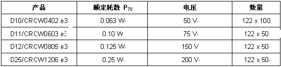 本次發(fā)布的4款設(shè)計套件采用E96系列阻值標(biāo)準(zhǔn),范圍從10Ω到1MΩ(每檔間隔4個阻值),同時額外包含一個0Ω跳線,每款套件總共包含122種不同的阻值。電阻的容差為±1%,TCR為±100ppm/K,功率耗散為0.063W~0.25W,電阻芯電壓為50V~200V。