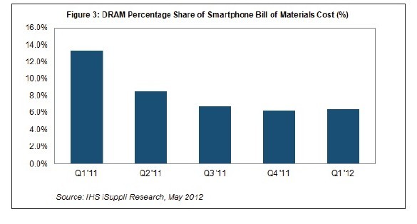 IHS iSuppli:DRAM占智能手機(jī)BOM成本的份額減半