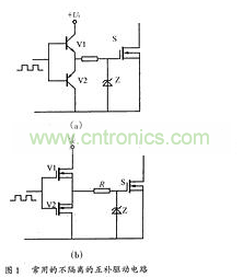 圖1(a)為常用的小功率驅(qū)動電路,簡單可靠成本低。適用于不要求隔離的小功率開關(guān)設(shè)備。圖1(b)所示驅(qū)動電路開關(guān)速度很快,驅(qū)動能力強(qiáng),為防止倆個MOSFET管直通,通常串接一個0.5~1Ω小電阻用于限流,該電路適用于不要求隔離的中功率開關(guān)設(shè)備。這兩種電路結(jié)構(gòu)特簡單。