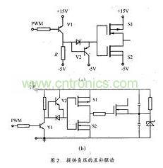 功率MOSFET屬于電壓型控制器件,只要柵極和源極之間施加的電壓超過其閾值電壓就會導(dǎo)通。由于MOSFET存在結(jié)電容,關(guān)斷時其漏源兩端電壓的突然上升將會通過結(jié)電容在柵源兩端產(chǎn)生干擾電壓。常用的互補(bǔ)驅(qū)動電路的關(guān)斷回路阻抗小,關(guān)斷速度較快,但它不能提供負(fù)壓,故其抗干擾性較差。為了提高電路的抗干擾性,可在此種驅(qū)動電路的基礎(chǔ)上增加一級由V1、V2、R組成的電路,產(chǎn)生一個負(fù)壓,電路原理圖如圖2(a)所示。