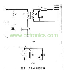 電路原理圖如圖3(a)所示,N3為去磁繞組,S2為所驅(qū)動的功率管。R2為防止功率管柵極、源極端電壓振蕩的一個阻尼電阻。因變壓器漏感較小,且從速度方面考慮,一般R2較小,故在分析中忽略不計。其工作波形分為兩種情況,一種為去磁繞組導(dǎo)通的情況,見圖4(a);一種為去磁繞組不導(dǎo)通的情況,見圖4(b)。