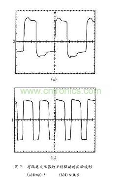 6(b)為占空比大于0.5時適用的驅(qū)動電路,其中Z2為穩(wěn)壓二極管,此時副邊繞組負(fù)電壓值較大,Z2的穩(wěn)壓值為所需的負(fù)向電壓值,超過部分電壓降在電容C2上,其實驗波形見圖7(b)。