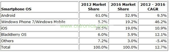 下表反映了IDC對2012年和2016年全球智能手機操作系統(tǒng)所占市場份額以及2012到2016年之間復合年增長率的預期: