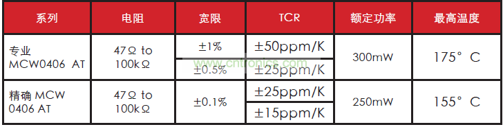 為了提高穩(wěn)定性,不論應(yīng)用場合是需要全功率能力還是只需要一小部分標(biāo)稱額定功耗,這些電阻都是同樣有效的。電阻有兩種型號。MCW 0406 AT 專業(yè)系列設(shè)備額定功耗高達(dá) 300mW,高溫性能達(dá)到 175°C。