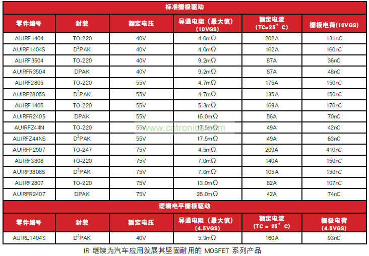 International Rectifier 的符合汽車(chē)標(biāo)準(zhǔn)的最新 MOSFET 系列具有低通態(tài)電阻和高電流處理能力,可滿足傳統(tǒng)內(nèi)燃機(jī)(ICE) 平臺(tái)以及微型和混合動(dòng)力汽車(chē)平臺(tái)方面的重負(fù)載應(yīng)用。