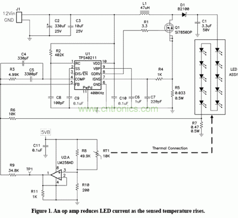 利用LED實(shí)現(xiàn)高亮度照明要求使用廠商允許的最大電流驅(qū)動(dòng),但LED的平均壽命高度取決于工作溫度。工作溫度僅上升10°便可使其壽命縮短一半。這種情況迫使設(shè)計(jì)人員必須降低調(diào)節(jié)電流,犧牲亮度來(lái)延長(zhǎng)使用壽命。如果要求LED在較高的環(huán)境溫度下工作,則必須進(jìn)一步降低電流來(lái)最小化環(huán)境到芯片溫升,以保證使用壽命。但是由于存在溫度上限,這樣做會(huì)降低中低環(huán)境溫度范圍的照明亮度。本質(zhì)上來(lái)說,我們是通過降低亮度來(lái)實(shí)現(xiàn)高溫環(huán)境工作的。圖1顯示了一個(gè)使用熱敏電阻控制運(yùn)算放大器(op amp) 的LED驅(qū)動(dòng)電路,其在LED電路板溫度上升時(shí)降低驅(qū)動(dòng)電流。