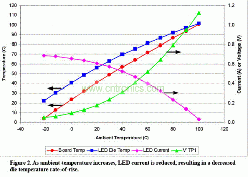 圖2 環(huán)境溫度上升,LED電流降低,從而達(dá)到更低的芯片溫升速率。