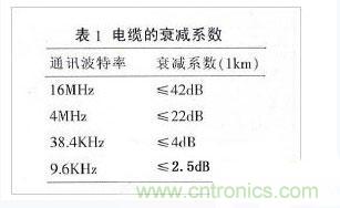 導(dǎo)線的電阻對信號的影響很小,可以忽略不計。電纜的分布電容C主要是由雙絞線的兩條平行導(dǎo)線產(chǎn)生。信號的損失主要是由于電纜的分布電容和分布電感組成的LC低通濾波器。通訊波特率越高,信號衰減也會越大。常規(guī)電纜的衰減系數(shù)見表1。