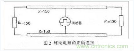 ②阻抗不連續(xù),顧名思義,與光從一種媒質(zhì)進(jìn)入另一種媒質(zhì)時所引起的反射是相似的。信號在傳輸線末端突然遇到電纜阻抗很小甚至沒有,信號在這個地方就會引起反射。消除這種反射最常用的方法,是在電纜的末端跨接一個與電纜的特性阻抗同樣大小的終端電阻,使電纜的阻抗連續(xù)。由于信號在電纜上的傳輸是雙向的,因此,在通訊電纜的另一端同樣要跨接一個相同大小的終端電阻,如圖2所示。