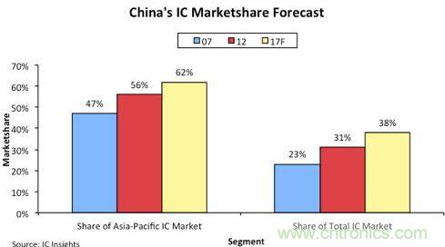 IC Insights表示,中國IC市場規(guī)模將由2014年的1000億美元,在2017年成長至1500億美元;該機(jī)構(gòu)估計,在2017年,中國市場將占據(jù)全球晶片市場38%的比例。而在2007年,中國晶片市場營收占據(jù)全球晶片市場營收的比例為23%。