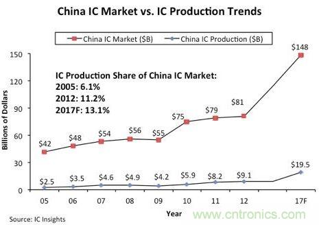市場研究機(jī)構(gòu)IC Insights的最新預(yù)測報告指出,中國IC市場可望在2012~2017年之間,以13%的復(fù)合年平均成長率(CARG)持續(xù)擴(kuò)張,報告同時指出,中國IC市場持續(xù)擴(kuò)張的背后,主要依靠來自外國制造商在中國地區(qū)的大規(guī)模投資建廠。