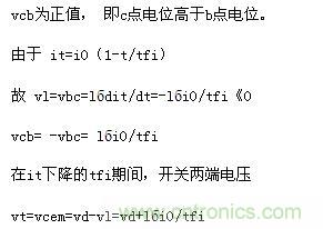 因此,在關(guān)斷過程一開始,vt立即從零上升到vcem,it在從i0下降至零期間,vt=vcem不變。直到it=0、id=i0以后,vt才下降為電源電壓vd,如圖5(b)所示。vcem超過vd的數(shù)值取決于lб、tfi和負(fù)載電流i0,顯然過快的電流下降率di/dt(即tfi?。?、過大的雜散電感l(wèi)б或負(fù)載電流過大都會引起關(guān)斷時元件嚴(yán)重過電壓,且伴隨著很大的功耗。