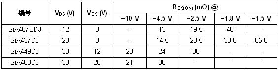 開(kāi)關(guān),以及智能手機(jī)、平板電腦、移動(dòng)計(jì)算設(shè)備、硬盤驅(qū)動(dòng)器和固態(tài)驅(qū)動(dòng)的同步降壓轉(zhuǎn)換應(yīng)用里的控制開(kāi)關(guān),-12 V SiA467EDJ提供了13m?(-4.5V)的極低導(dǎo)通電阻。-20V SiA437DJ的導(dǎo)通電阻為14.5m?(-4.5V),-30V SiA449DJ和SiA483DJ的導(dǎo)通電阻分別只有20m?(-10V)和21m?(-10V)。另外,SiA437DJ和SiA467EDJ的電流等級(jí)高達(dá)30A,承受很大的涌入電流,可用于負(fù)載開(kāi)關(guān)。
