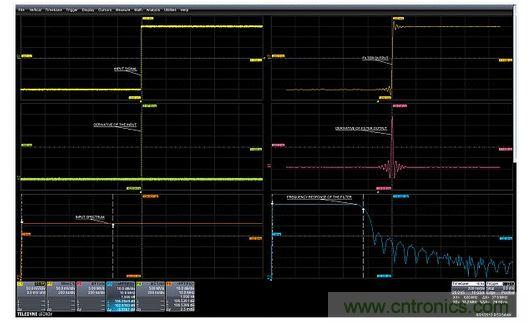 圖1:先將快速邊沿測試信號加到濾波器的輸入端(左上),然后用濾波器輸出(右上曲線)對它進行微分(右中),最后求FFT的平均值(下右),就可以得到濾波器的頻率響應(yīng)。左下邊曲線中的頻譜展示了微分過的階躍輸入信號的頻率平坦度。
