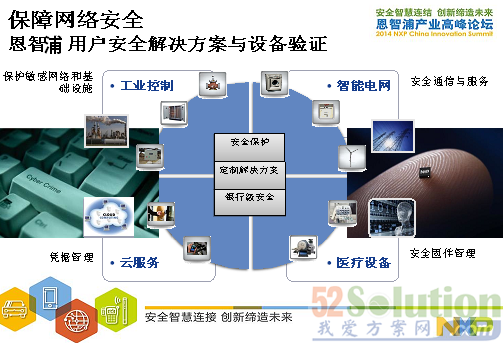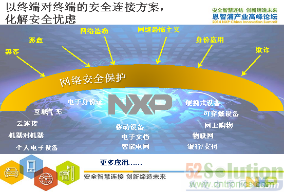 從以上圖中可以看到NXP保障網(wǎng)絡(luò)安全的方案,從工業(yè)控制,智能電網(wǎng),醫(yī)療設(shè)備和云服務(wù)方面。另外,NXP也提供以終端對(duì)終端的安全連接方案在互聯(lián)汽車、物聯(lián)網(wǎng)和便攜的可穿戴式應(yīng)用。
