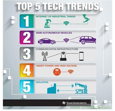 在迎接2015到來之際,我們有必要花時間來評估和預(yù)測未來的一年中將會出現(xiàn)的技術(shù)挑戰(zhàn)和突破創(chuàng)新。通過與眾多戰(zhàn)略客戶、大學(xué)合作伙伴以及TI產(chǎn)品線的技術(shù)專家進(jìn)行探討后,我們認(rèn)為TI將在一些重要技術(shù)趨勢中發(fā)揮戰(zhàn)略性作用。這些技術(shù)趨勢正推動著汽車和工業(yè)等多個市場的發(fā)展,而在此過程中,TI的工程師將幫助應(yīng)對半導(dǎo)體技術(shù)領(lǐng)域的獨特挑戰(zhàn),并利用先進(jìn)技術(shù)改善我們的生活。