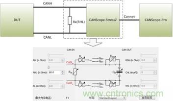 由此可見(jiàn),該方法雖然可以大致測(cè)量出CAN節(jié)點(diǎn)的差分電平位信號(hào)特征,但由于其用于做分析的樣本很少,測(cè)量方式有很難操作,所以為了提高測(cè)量結(jié)果的準(zhǔn)確度,減低人工成本,文章中對(duì)測(cè)試方法進(jìn)行了改進(jìn),使用CANScope-Pro總線分析儀、CANScope-StressZ擴(kuò)展板,使用配套軟件的樣眼圖與對(duì)稱(chēng)性測(cè)試進(jìn)行測(cè)量。