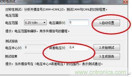 注意:由于GMW3122規(guī)定CANH+CANL的電壓要在4.2V~5.8V,而正常為5V。所以在采用對(duì)稱(chēng)性測(cè)試時(shí),其中使用的是(CANH+CANL)/2進(jìn)行判別。 所以標(biāo)準(zhǔn)范圍為2.1V~2.9V,正常為2.5V。因此圖7中誤差電壓需要填入0.4。