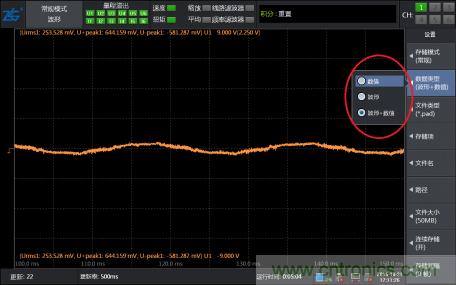 第四步,找到了想要觀察的波形幀之后,可以通過“FORM按鍵調(diào)整界面的窗口時(shí)間,對(duì)波形進(jìn)行任意放大或縮小”并可以調(diào)出光標(biāo)測量任意兩點(diǎn)的橫縱軸數(shù)據(jù)??吹竭@里我相信大部分人已經(jīng)可以找到自己想要看的波形了。但是想要把波形存儲(chǔ)記錄下來怎么辦,而且想要長時(shí)間記錄可以實(shí)現(xiàn)嗎?不要急,PA功率分析儀還提供波形保存記錄功能。
