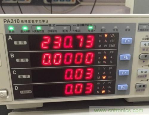 首先,可以從第一張圖中看到,PA310的“最大保持”指示燈亮著,此時打開了最大保持功能,也就是說儀器上顯示的數(shù)據(jù)是最大值,而不是實(shí)時數(shù)據(jù)。其次在第二排電流顯示窗口,沒有看到電流值,而在第三排功率顯示窗口中卻有功率數(shù)據(jù),由此可知電流量程選擇太大,這樣會給測量帶入更大的量程誤差。