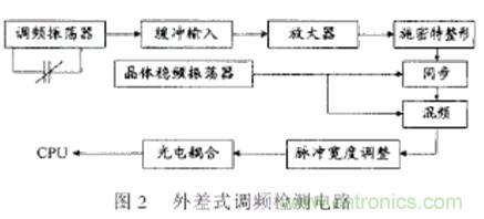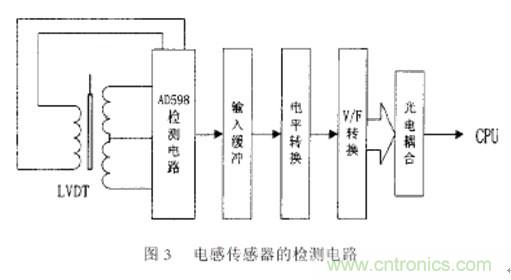 如圖3所示,由于采用了最新的大規(guī)模集成電路,電感傳感器的檢測電路比較簡單,且集成電路采用了新的調(diào)制解調(diào)方法和算法,減少了以前的檢測外差式調(diào)頻檢測電路方法由于傳感器的激勵(lì)信號(hào)的相角、頻率以及幅值漂移對檢測結(jié)果的影響,大大進(jìn)步了檢測精度和穩(wěn)定性。