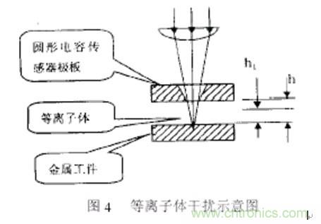 在工件尚未被切穿的瞬間,激光和金屬相互作用,在噴嘴和加工對象之間產(chǎn)生云霧狀等離子體,改變電容極板之間的介質(zhì),從而對電容傳感器產(chǎn)生干擾。在正常切割過 程中,輔助氣體將等離子體從切縫中吹散,對電容傳感器產(chǎn)生影響較小。但假如加工速度太快和剛開始切割時(shí),由于工件未被完全切穿,激光照射點(diǎn)四周會(huì)產(chǎn)生等離 子體云,對電容傳感器產(chǎn)生干擾,嚴(yán)重時(shí)甚至使傳感器無法正常工作,嚴(yán)重影響加工質(zhì)量。圖4為等離子體干擾示意圖。