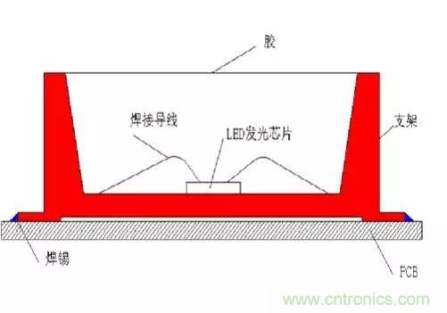 眾所周知,回流焊爐內(nèi)一般會有240°的高溫。如果環(huán)氧樹脂膠TG點(diǎn)過低,或封裝過程有潮氣吸入,高溫會導(dǎo)致膠體非線性急劇膨脹,導(dǎo)致LED芯片焊線拉斷破壞失效。另外高溫會通過支架管腳將熱量快速傳導(dǎo)到芯片,造成芯片體龜裂碎化失效的可能性增加。而這種問題是最可怕的,一般在工廠老化測試時也不會出現(xiàn)問題,經(jīng)過運(yùn)輸?shù)娇蛻舳嗽偈褂靡欢螘r間問題就會逐步暴露出來。