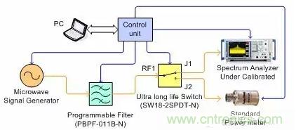 在圖1中,微波信號發(fā)生器所產(chǎn)生的信號經(jīng)過一個可編程的帶通濾波器到達一個SPDT微波開關(guān)的輸入端(RF1),開關(guān)的二個輸出端J1和J2分別接需要被校準的頻譜分析儀和標準功率計。在校準測試過程中,功率計讀一次來自信號源的幅度后,開關(guān)即刻切換到頻譜分析儀,并記錄頻譜分析儀針對信號源幅度的讀數(shù)。