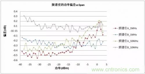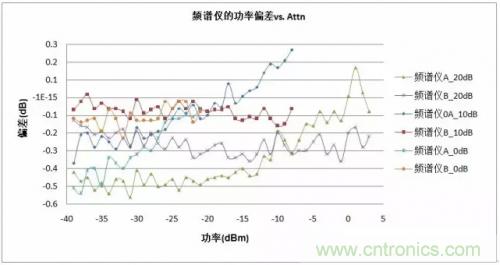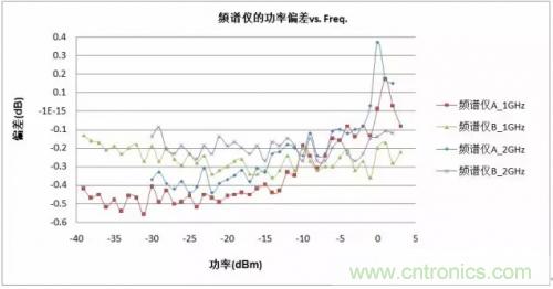 在測試過程中,每個參數(shù)的變化均以功率計為參照值,頻譜分析儀與功率計讀數(shù)的差值即為頻譜分析儀的精度偏差。