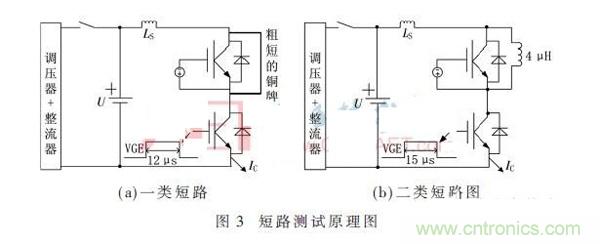 圖3(a)為一類短路測試原理圖,電網(wǎng)電壓經(jīng)過調(diào)壓器和整流橋,將母線電容電壓充到1 500 V,上管igbt的門極被-15 V關(guān)斷,且用粗短的銅排將其短路。對下管的IGBT釋放一個12 μs的單脈沖,直通就形成一類短路。圖3(b)為二類短路測試原理圖,將母線電容電壓同樣充到1 500 V,上管IGBT的門極被-15 V關(guān)斷,且給上管并聯(lián)一個4 μH的電感作為負(fù)載,下橋臂通過IGBT驅(qū)動器釋放一個15 μs的單脈沖就形成二類短路。