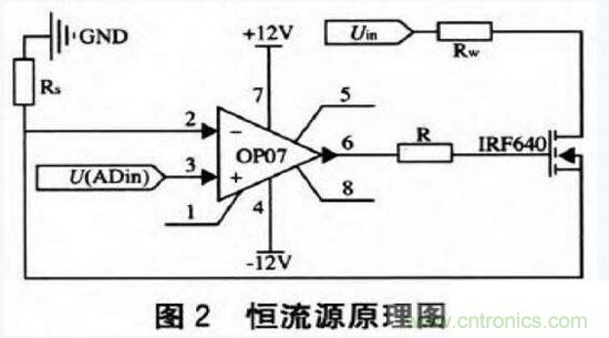 通過(guò)16位高精度模數(shù)轉(zhuǎn)換器ADSlll5輸出電壓給恒流源電壓轉(zhuǎn)換恒定電流電路,由于運(yùn)算放大器OP07是精度高、低漂移運(yùn)算放大器,并且在10歐負(fù)載的情況下輸出電流能達(dá)到2 A。所以采用OP07和IRF640組成的一個(gè)Uin。電流串聯(lián)負(fù)反饋來(lái)實(shí)現(xiàn)電壓到電流的轉(zhuǎn)換,具體電路如圖2所示。
