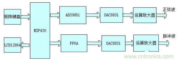 單片機控制AD9851產(chǎn)生頻率和相位都可控的正弦波,頻率量由鍵盤設定,步進量為5Hz,AD9851頻率分辨率為0.006985Hz,完全能夠滿足要求。正弦信號送入DAC8831的基準輸入端,單片機控制DA的數(shù)字量調節(jié)其幅值,設置按鍵調整幅值可實現(xiàn)100mv的步進。在單片機的控制下編程在FPGA內部產(chǎn)生占空比可調的脈沖波,單片機向FPGA送入占空比值和頻率值,F(xiàn)PGA通過計數(shù)值從而改變輸出脈沖波的占空比和頻率,設置按鍵調整占空比和幅值。正弦信號送入DAC8831的基準輸入端,單片機控制DA的數(shù)字量調節(jié)其幅值,設置按鍵調整幅值可實現(xiàn)100mv的步進。