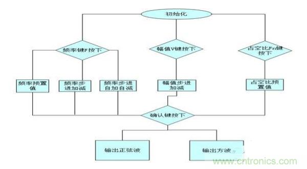 本系統(tǒng)要求在給定±15V電源電壓條件下設計出一個能產(chǎn)生正波和脈沖波的信號源。信號頻率為20Hz~20kHz,頻率能程控步進調整(步長為5Hz),脈沖波的占空比在2%~98%之間能程控步進調整(步長2%),兩路信號均要求幅值在100mv到3V步進可調(步長為100mv),要求性能良好(頻率穩(wěn)度高,非線性失真小等),方案考慮如下: