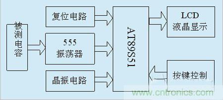 一般元件參數(shù)的數(shù)字化測量是把被測參數(shù)轉(zhuǎn)換成頻率后再進行測量,本設計采用555為核心的振蕩電路,將被測電容值轉(zhuǎn)化為頻率,并利用AT89S51處理器測量出頻率,再通過該頻率值計算出電容參數(shù)值。