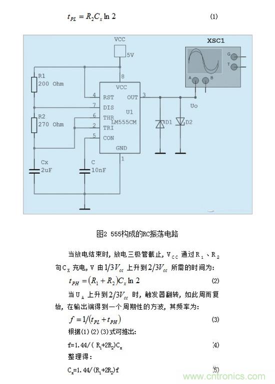 由555芯片構成的多諧振蕩電路如圖2,CX為被測電容,接通電源后,CX被充電,A點電壓UA上升。當UA上升到時,觸發(fā)器被復位,同時555芯片內(nèi)部放電三極管導通,此時U0為低電平。CX通過R2和放電三極管放電,使UA下降。當UA下降到時,觸發(fā)器又被置位,U0翻轉(zhuǎn)為高電平。CX放電所需的時間為: