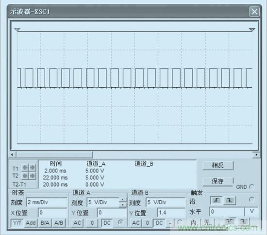 由上式可知,當電路設計完成后,振蕩器輸出f隨CX的變化而改變。改變R1、R2的值即可改變系統(tǒng)量程。系統(tǒng)量程分為四檔:(1)R1+2R2=470KΩ時,測1.0nF-10.0nF的電容值。(2)R1+2R2=47KΩ時,測10.0nF~100.0nF的電容(3)R1+2R2=4.7KΩ時,測100.0nF~1000.0nF的電容。(4)R1+2R2=470Ω時,測1.0μF~10.0μF的電容。圖3為R1+2R2=470KΩ時,測量電容為2μF振蕩輸出輸出波形。