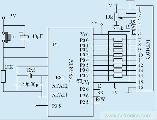 信號處理電路部分采用單片機AT89S51作為系統(tǒng)的主控制器。AT89S51單片機的最小系統(tǒng)由時鐘電路、復位電路、外加電源及單片機構成,其硬件電路如圖4所示。555振蕩電路輸出的是脈沖波,接到AT89S51處理器的輸入引腳P3.5,通過AT89S51內(nèi)部定時/計時器T0、T1及相應的程序設計,構成一個數(shù)字式頻率測量系統(tǒng),測出頻率后按(5)式運算處理后得到被測電容值。